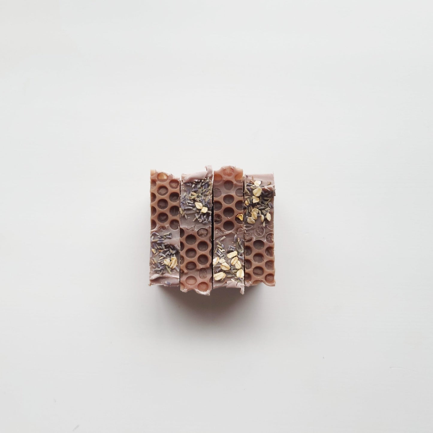 Ingredients - Olive Oil, Coconut Olive, Castor Oil, Cocoa Butter, Shea Butter, Coconut Milk, Sodium Hydroxide, Distilled Water, White Kaolin Clay, Lavender Honey, Colloidal Oatmeal, Essential Oils {Lavender, Ylang Ylang & Litsea}, Lavender Buds, Rolled Oats